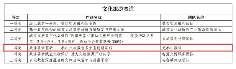 喜報(bào)!泰山文旅集團(tuán)元泰山數(shù)科團(tuán)隊(duì)獲2025年“數(shù)據(jù)要素×”大賽山東分賽文化旅游賽道二等獎(jiǎng)